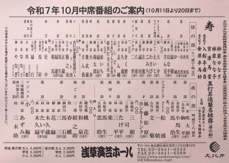 浅草演芸ホールの公式X(旧Twitter)でお知らせします。